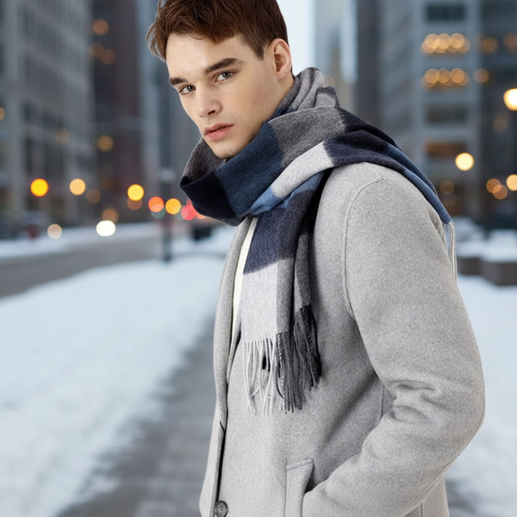 Gdy temperatury spadają, często brakuje odpowiedniego akcesorium, które zapewnia ciepło i jednocześnie dobrze wygląda. Ten długi wełniany szalik zachwyca szczególnie miękką fakturą i wyrazistym wzorem w kratę. Gęsta struktura wełny zatrzymuje ciepło i chroni przed zimnym wiatrem. Frędzle i stonowane kolory nadają szalikowi swobodny, a jednocześnie elegancki wygląd.