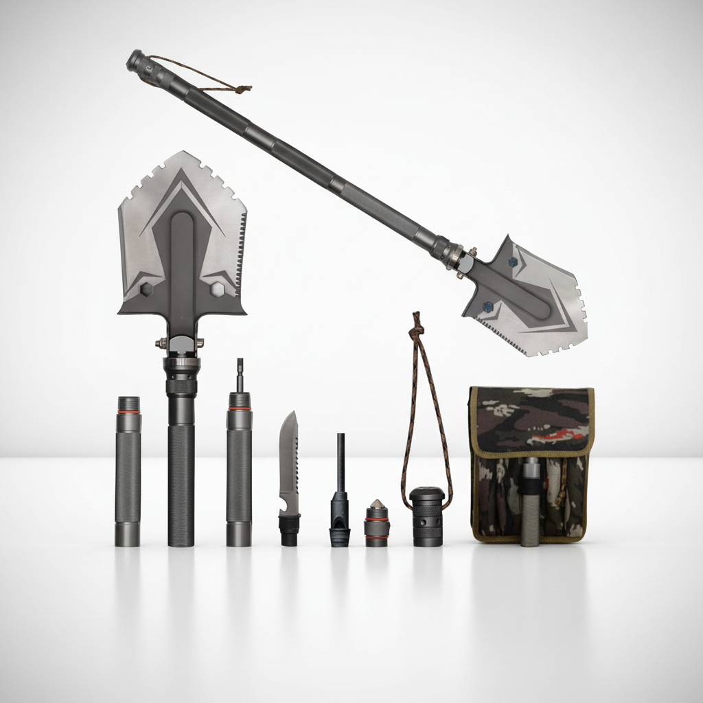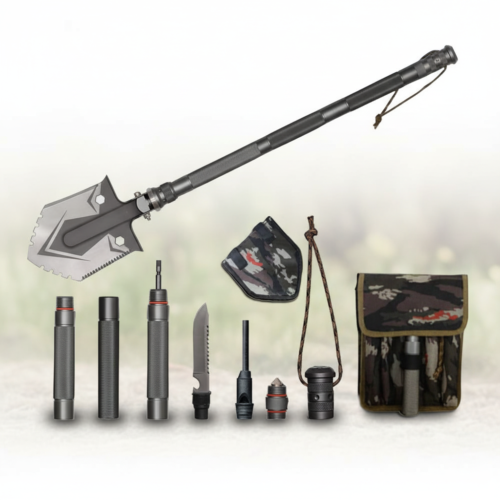 Ten zestaw łączy łopatę, siekierę, piłę i inne narzędzia w jednym urządzeniu. Nie musisz zabierać ze sobą wielu ciężkich elementów.