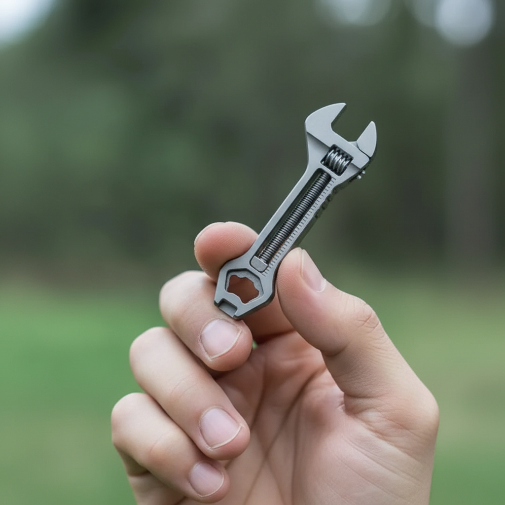 Małe problemy w drodze mogą szybko zepsuć wyjazd. To kompaktowe, wielofunkcyjne narzędzie rozwiązuje wiele codziennych zmartwień przy użyciu kilku ruchów. Łączy praktyczne pomocniki, takie jak regulowany klucz i otwieracz do butelek, w przenośnym formacie. Wytrzymała stopa cynk-aluminium zapewnia długotrwałą niezawodność, nawet przy częstym użytkowaniu.