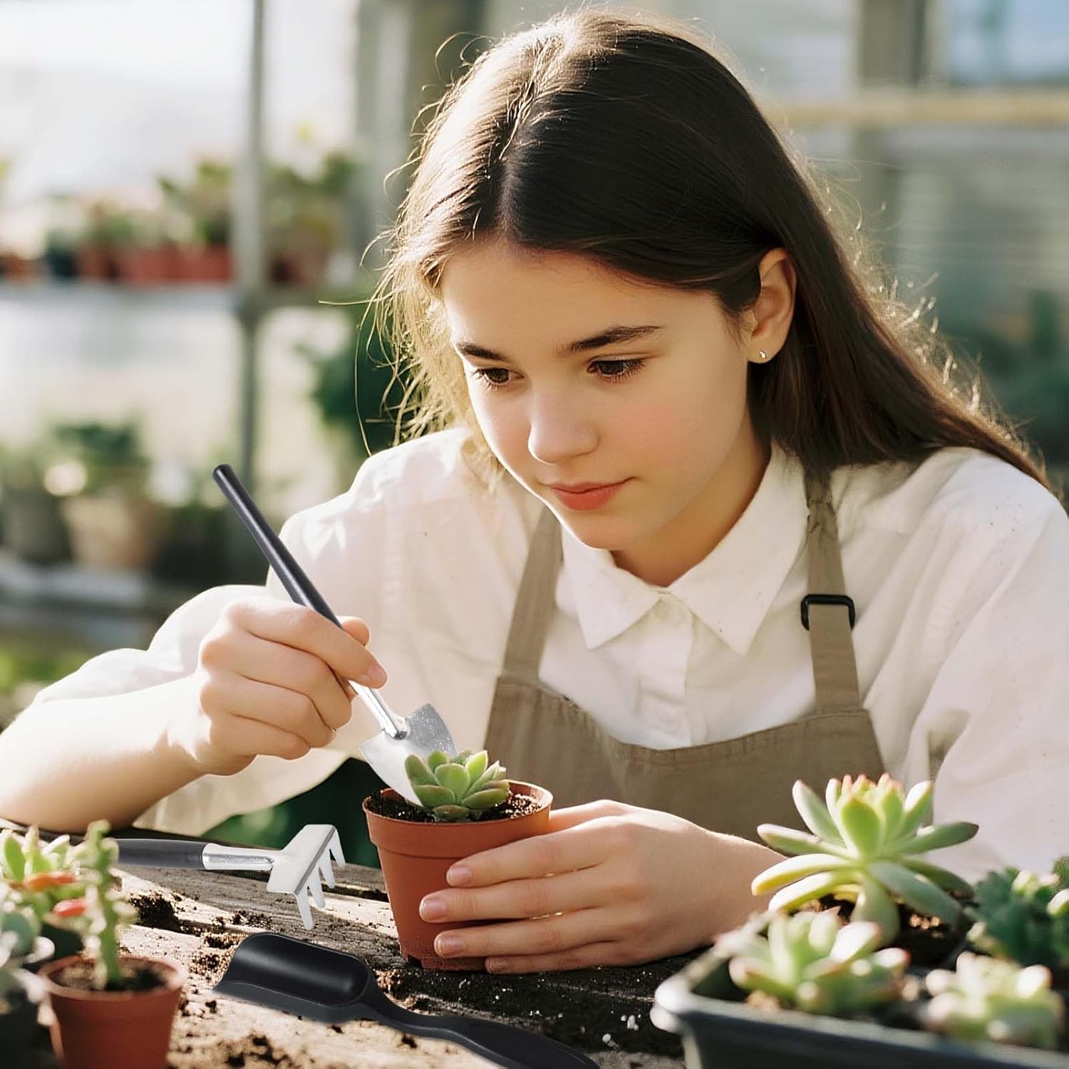 Ten 12-częściowy zestaw do pielęgnacji sukulentów zawiera nożyczki, łopatki, grabi, dziurkacz, łyżkę, pęsetę oraz torbę do przechowywania z lnu. Został zaprojektowany do przesadzania, przycinania i chwastowania, a jego waga wynosi zaledwie 165 g, dzięki czemu jest lekki i kompaktowy. Główki narzędzi ze stali nierdzewnej oraz wielokrotnego użytku torba do przechowywania zapewniają, że wszystko pozostaje zorganizowane, idealne do pielęgnacji roślin doniczkowych lub jako prezent.