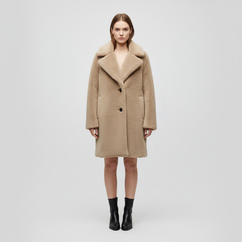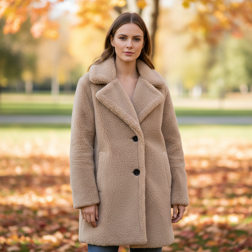 Płaszcz z wysokiej jakości materiału teddy oferuje doskonałe ciepło. Idealny na chłodne jesienne i zimowe dni.