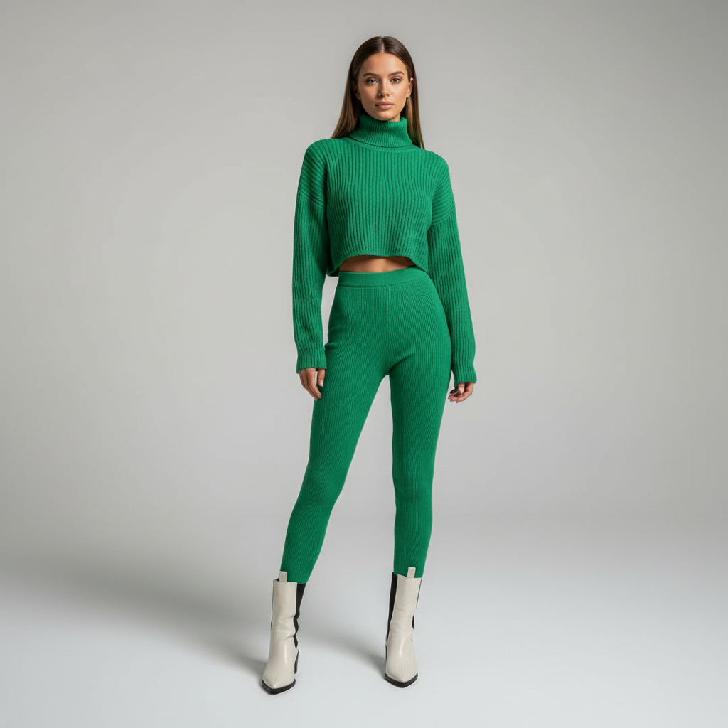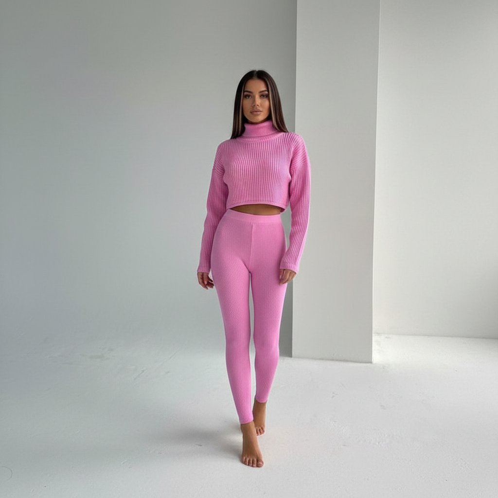 W zimnym okresie ważne jest, aby być ubranym ciepło, a jednocześnie stylowo. Ten zestaw łączy komfort i trendy w przyciągający wzrok sposób, który sprawia radość. Miękki materiał zapewnia przyjemne uczucie noszenia, podczas gdy wysoki kołnierz zapewnia dodatkowe ciepło. Dopasowane spodnie i crop-top doskonale podkreślają Twoją sylwetkę.