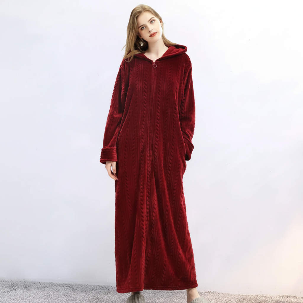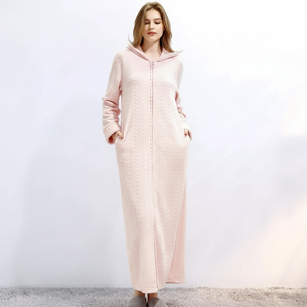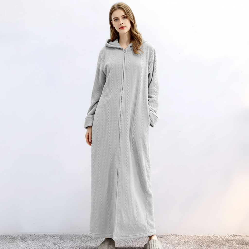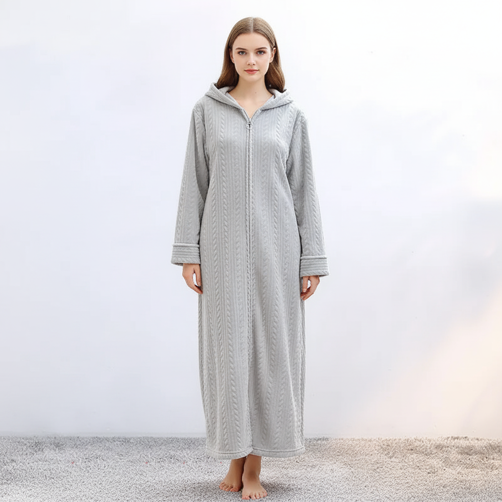 Dzięki wszechstronnemu zamkowi błyskawicznemu szlafrok można łatwo zakładać i zdejmować. Twój wygląd pozostaje elegancki i bezproblemowy przez cały czas.